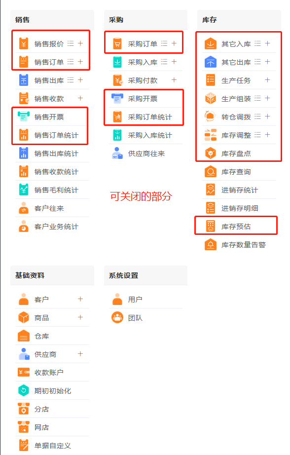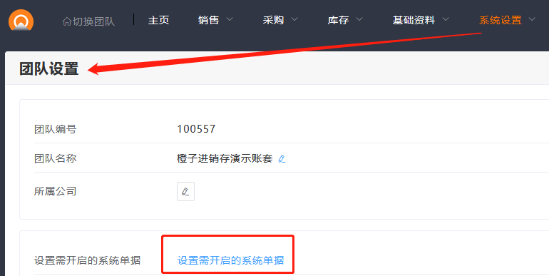 进销存包含有销售、采购、库存的全套流程单据,为了适合大家不同的需要,设置了系统单据开启功能,管理员可以在团队设置中,选择是否关闭开启单据。