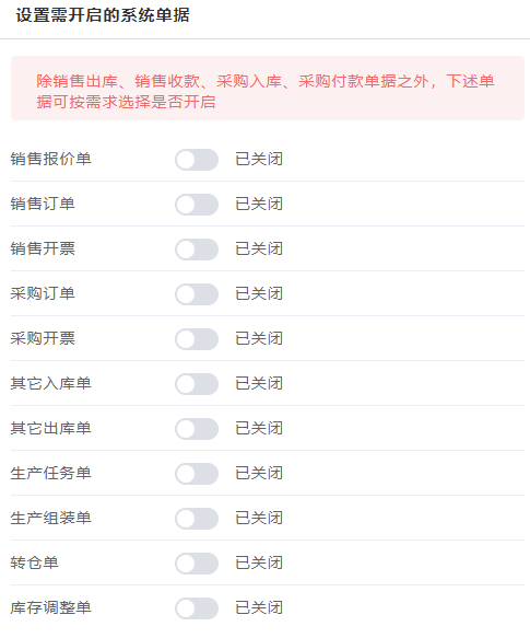 创建团队时,为了便于大家选择,首页默认开启所有单据