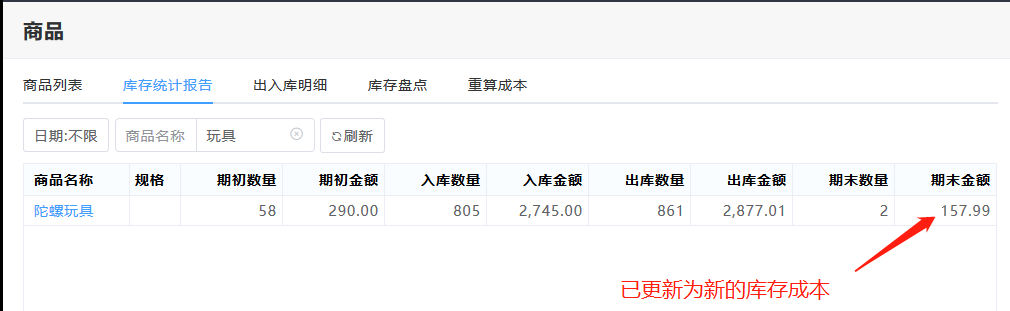 重新计算成本,库存统计列表里的金额会刷新。