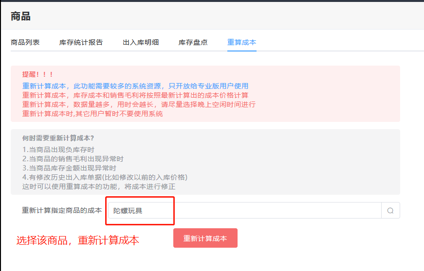 在商品列表里,可以重新计算成本。