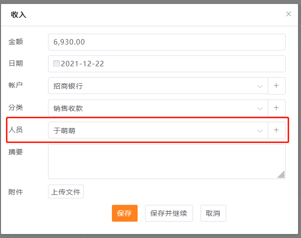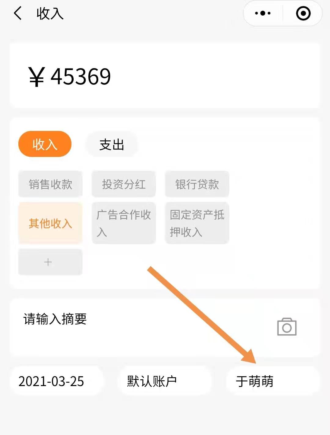 3.同时在输入收支纪录时,就会增加一个人员的输入项,可以输入人员的姓名。