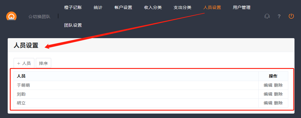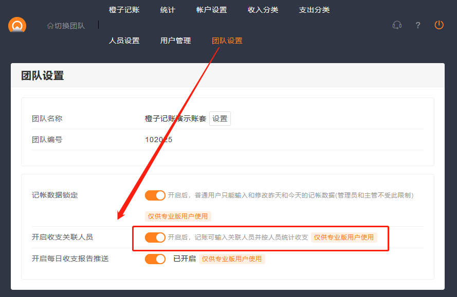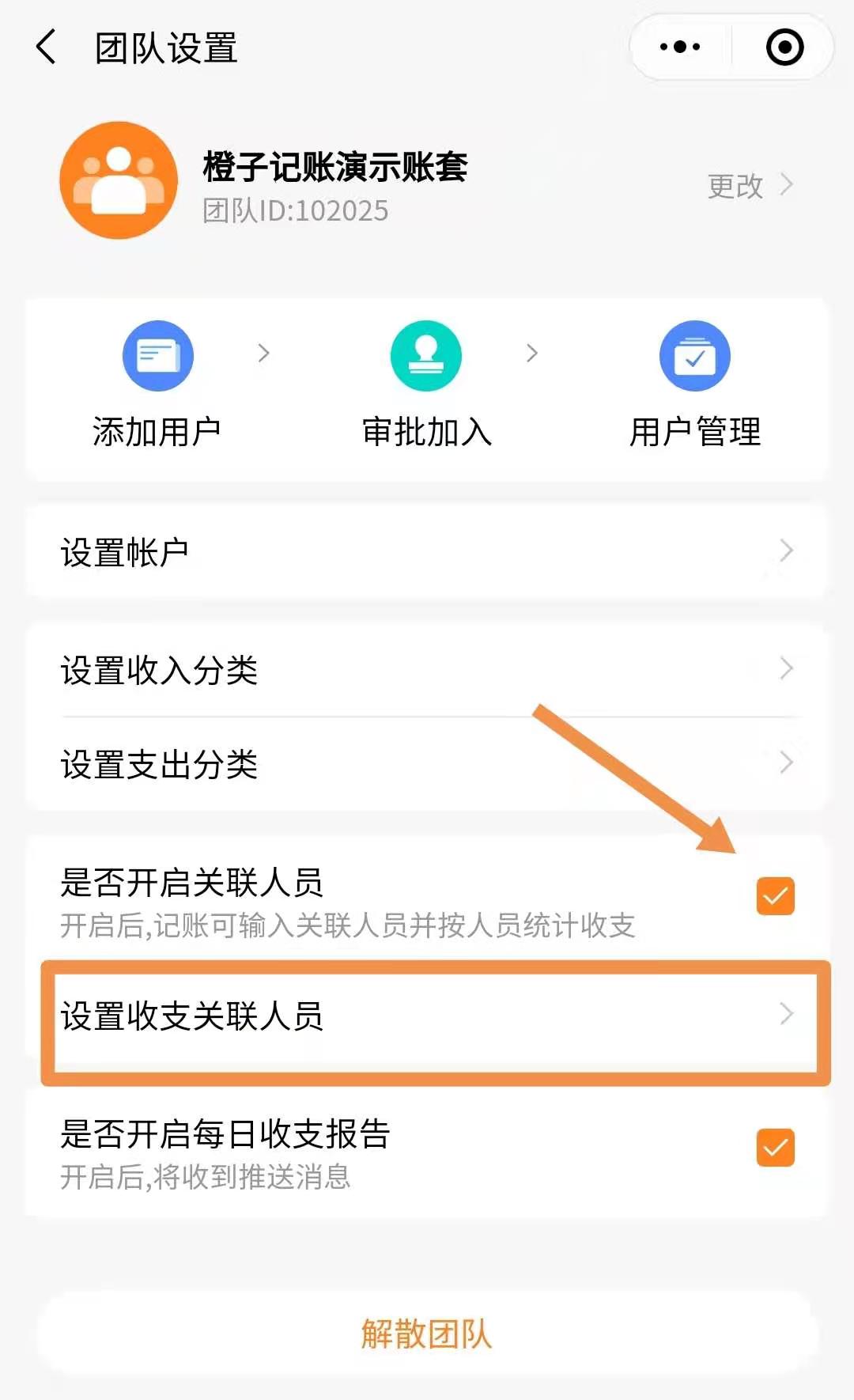 如果需要按人员统计收支纪录或查看收支明细,可以在团队设置中,开启输入人员的选项。