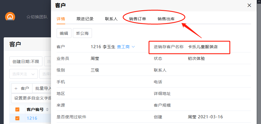 在CRM中,客户详情则可以查看进销存中的订单及出库单等