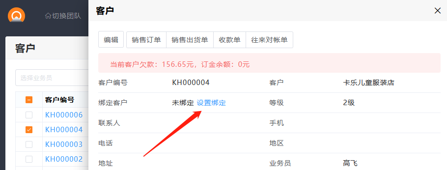 绑定成功后,进销存的客户详情可以绑定CRM的客户。