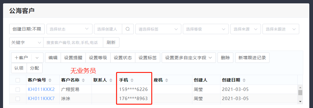 公海客户列表:无业务员,座机和手机号会隐藏。