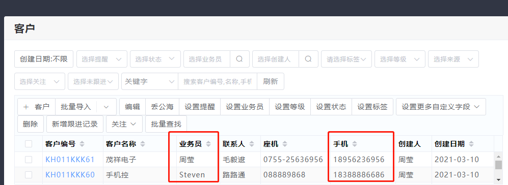 客户列表:有业务员,座机和手机号显示。