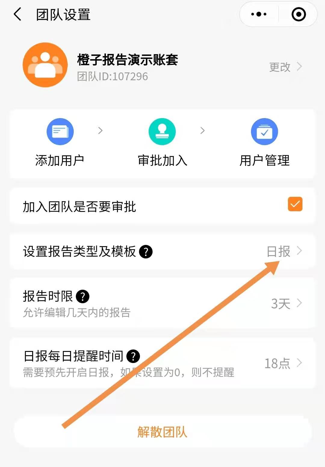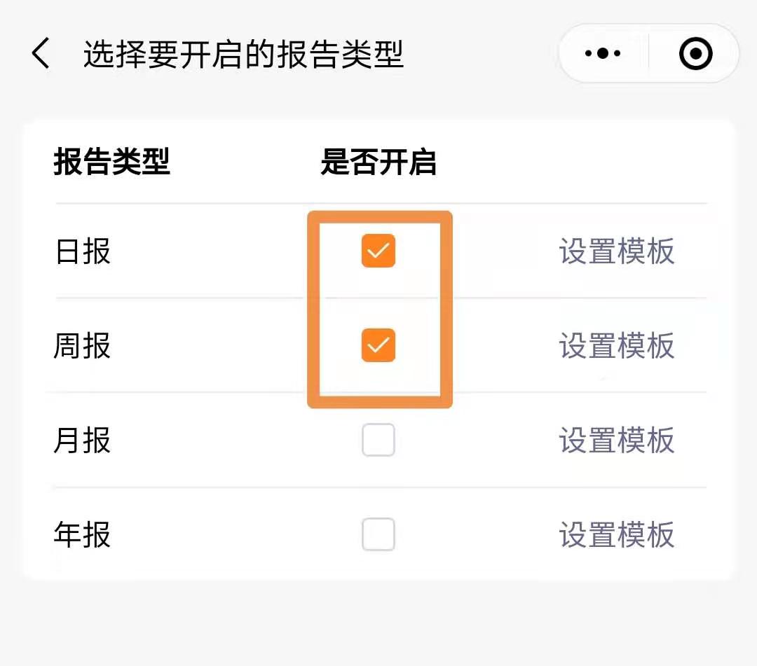 橙子报告中设置多种报告类型:日报、周报、月报、年报,可以按需开启需要的报告类型。
