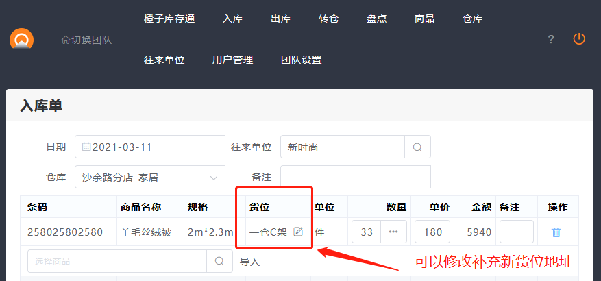 三、新增入库单时,如果货位有变更,或者货位有增加,可以直接补充。例如:A架2层,变为A架2层左边
