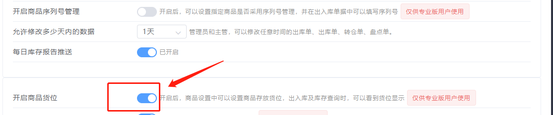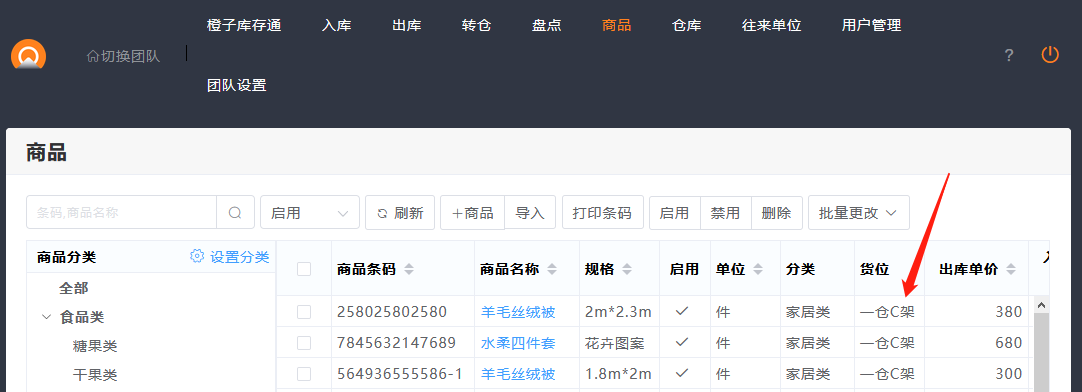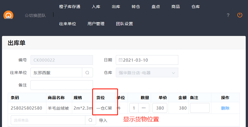 货位管理:商品设置中设置商品存放货位,出入库及库存查询时,可以看到货位显示