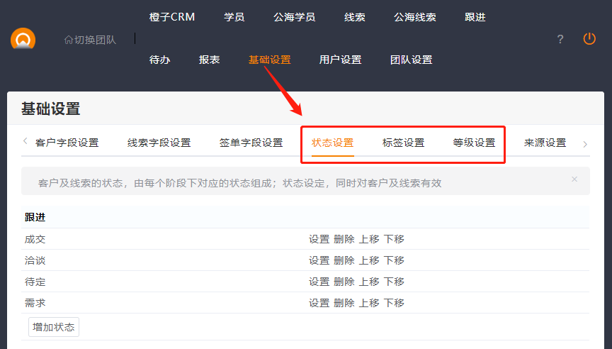 状态:一个客户仅能有一个状态,这个状态代表一个客户跟进的阶段,系统已经有默认的状态,也可以修改。