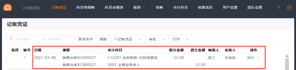 在会计团队中,则可以查看进销存中生成的记帐凭证等。