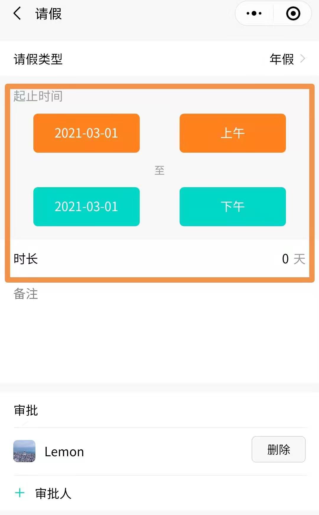 - 需填写请假类型,同时申请可以选择具体日期。