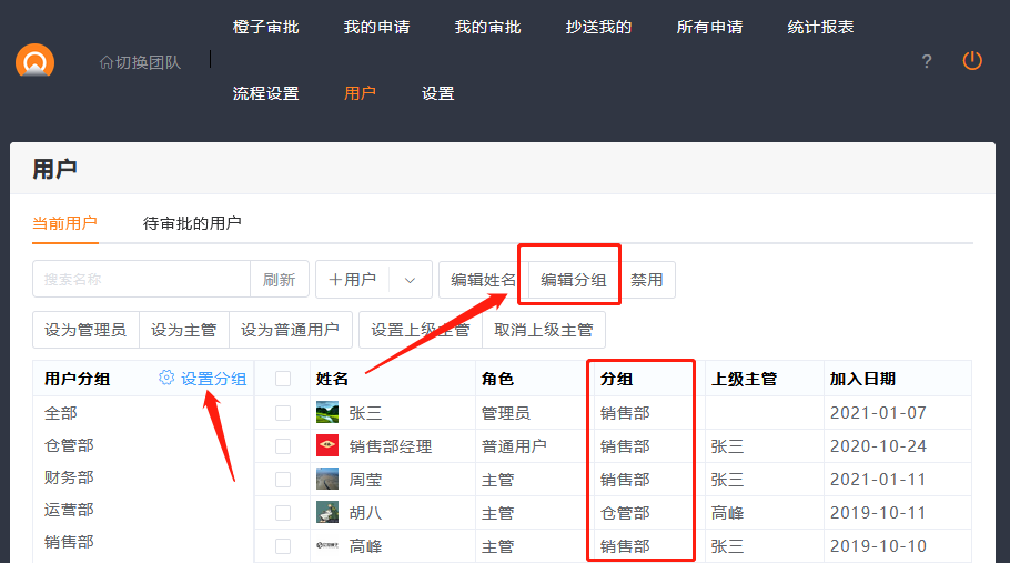 人员分组,可由管理员在用户列表中设置。