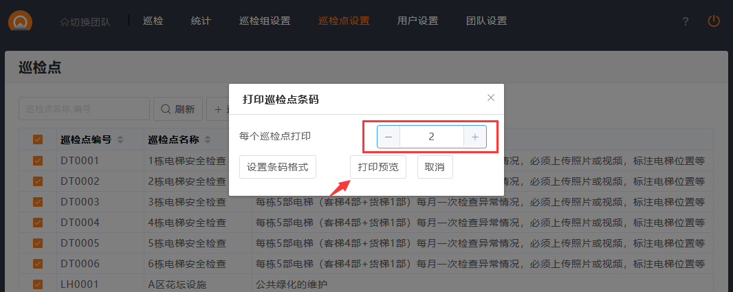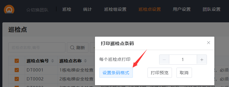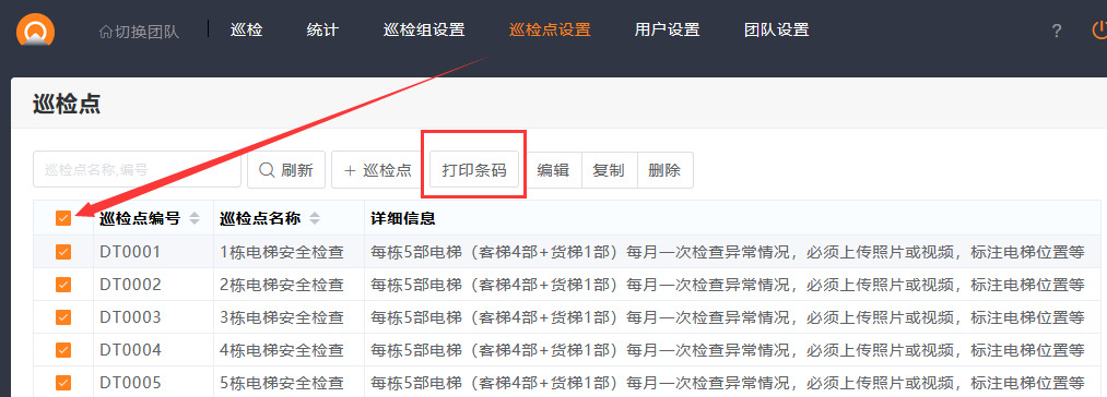 2.巡检点列表,选择有编号的巡检点,点击打印条码。
