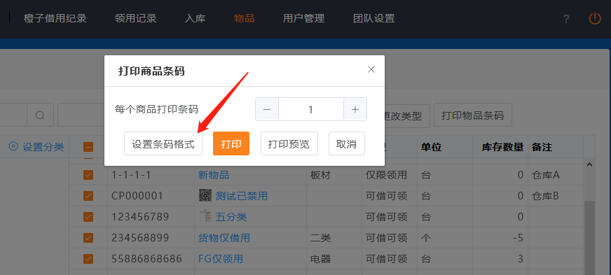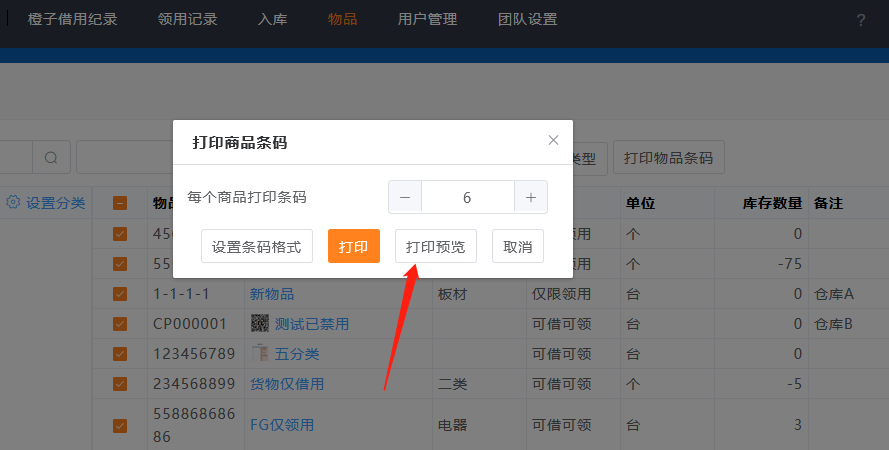 橙子借用物品列表,物品编号不仅可用于查询商品,还可以生成条形码,出入库时可以通过扫描条形码,选择商品。
