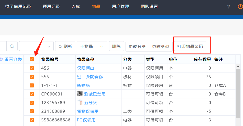 2.物品列表,选择有编号的物品,点击打印条码。