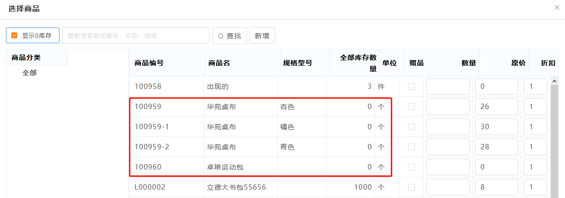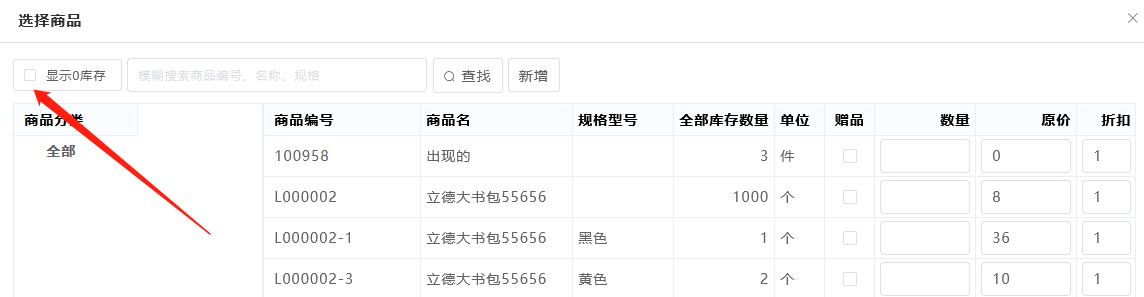 因此,如果出库单选择商品时,找不到想要的商品时,可以点击左上角的按钮:显示0库存,即可显示所有商品。