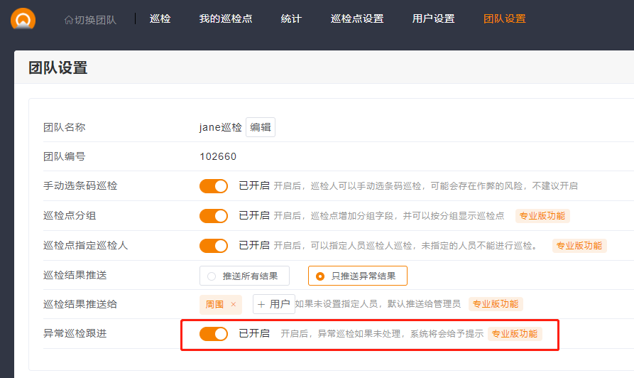 4.同时,可以在团队设置中,开启异常巡检跟进功能,对有异常的巡检记录,做进一步的跟进处理。