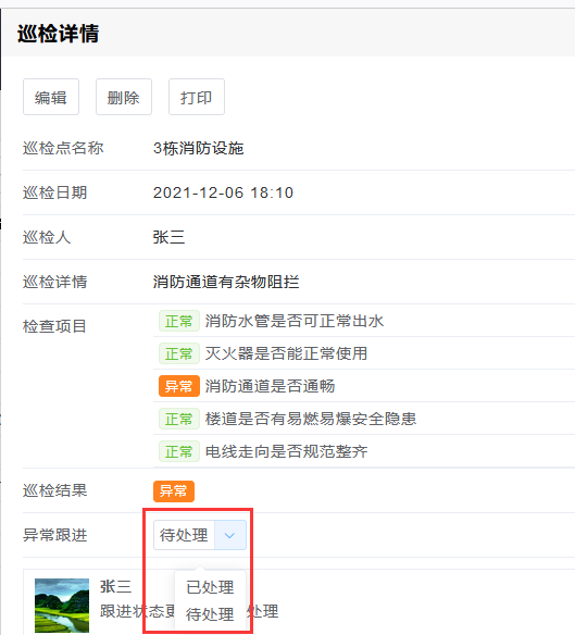 5. 高峰在处理完这个巡检记录的问题后,此异常巡检结果,可以修改异常跟进状态,是否已处理等。