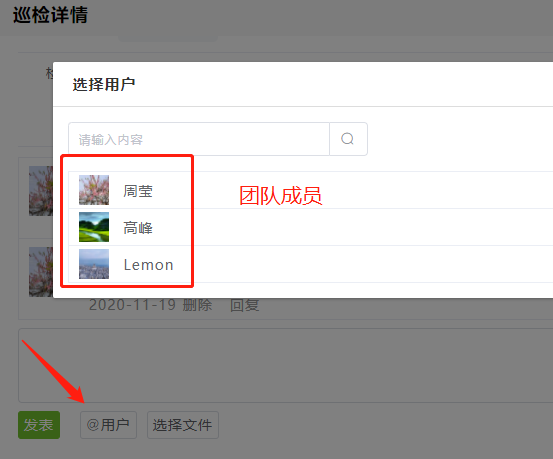 在讨论区可以@相应人员,发送信息,交流下一步处理事宜等。