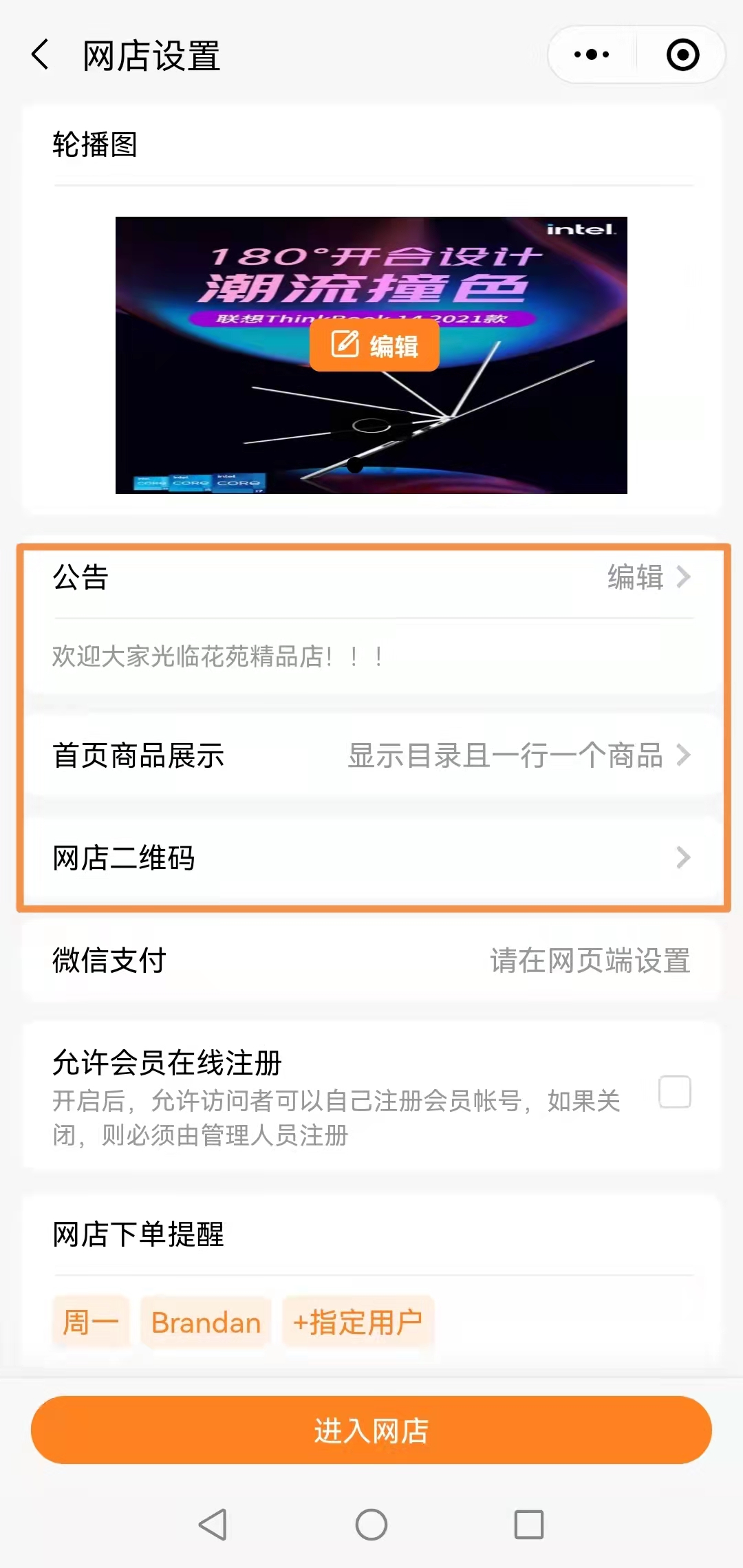 3.网店设置,可以设置轮播图,店铺公告及商品展示等。