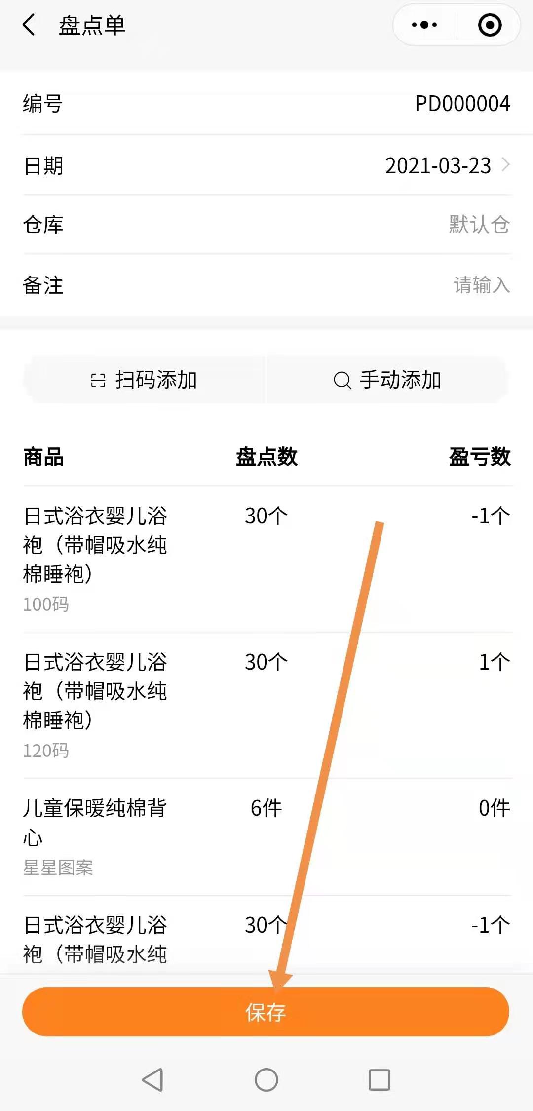 3.保存盘点单,代表已经盘过的库存,默认隐藏库存和盘点数皆为0的商品。