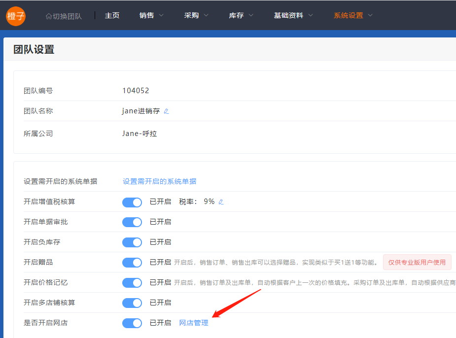 一、进入WEB端进销存团队设置页面,点击【网店管理】,进入微信支付商户申请