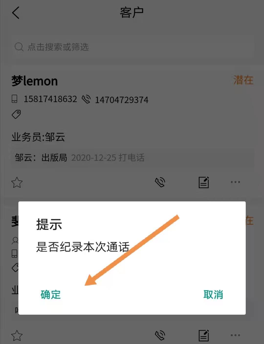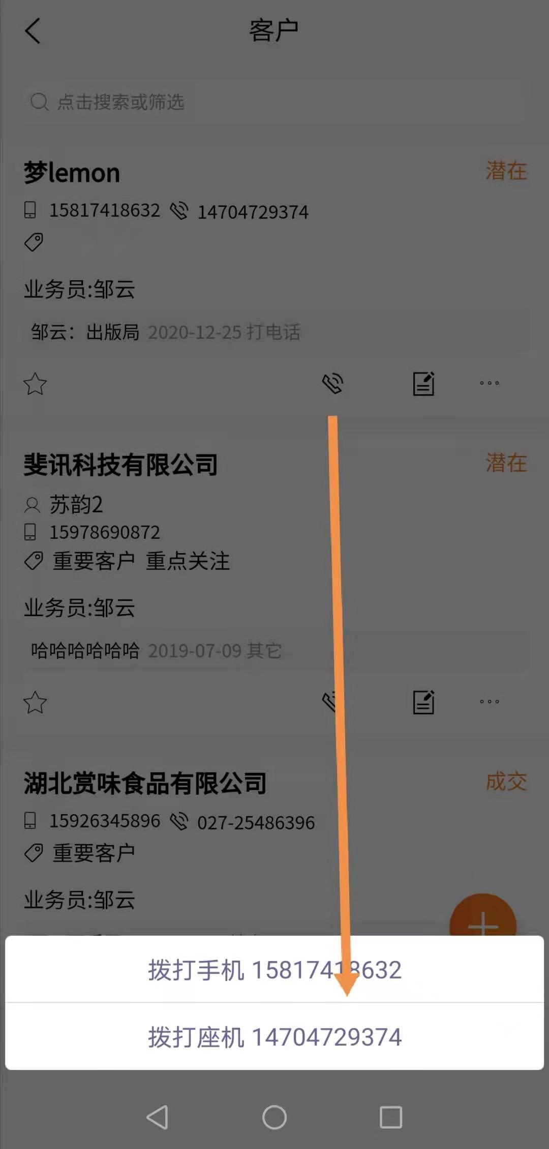 2.在客户列表或者线索列表,点击打电话或者座机