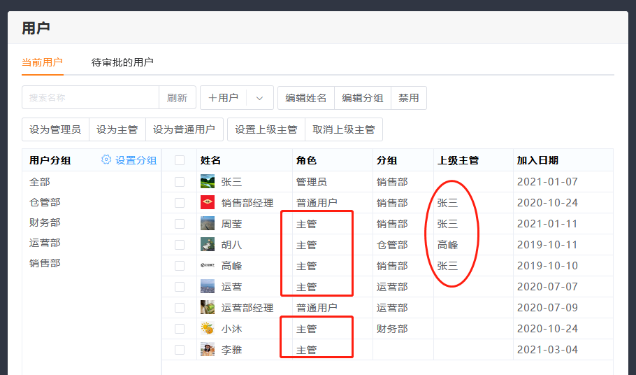 管理员在用户列表设置用户权限时,可以看到有主管和上级主管。