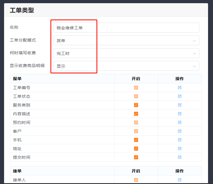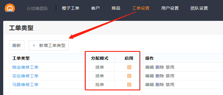 设置工单类型,可以按照不同类型,设置工单内容。