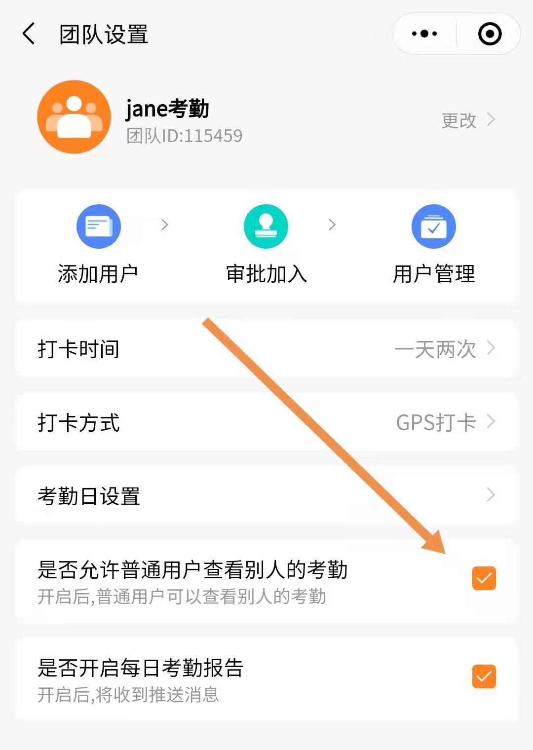 - 管理员在团队设置中,开启普通用户查看别人的考勤。