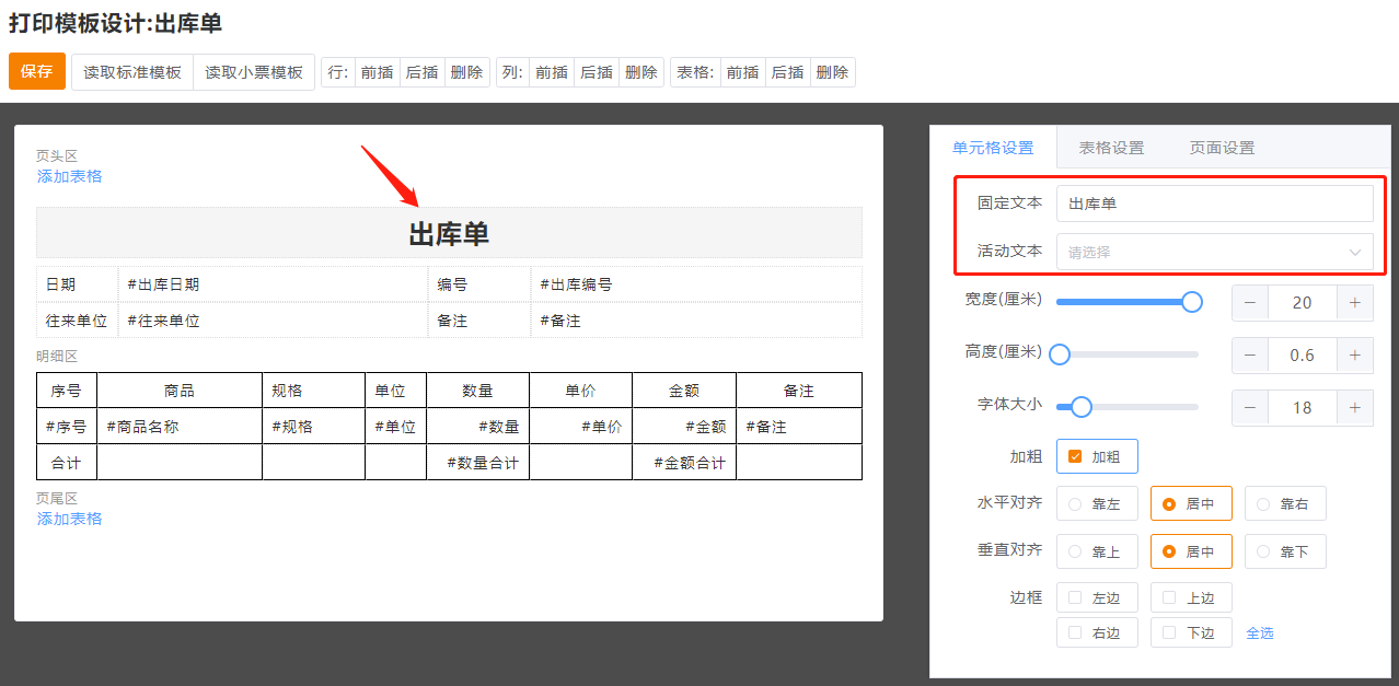 活动文本指,可读取系统中数据字段的内容,例如“#金额合计”;固定文本指固定的字段名称,例如“合计”