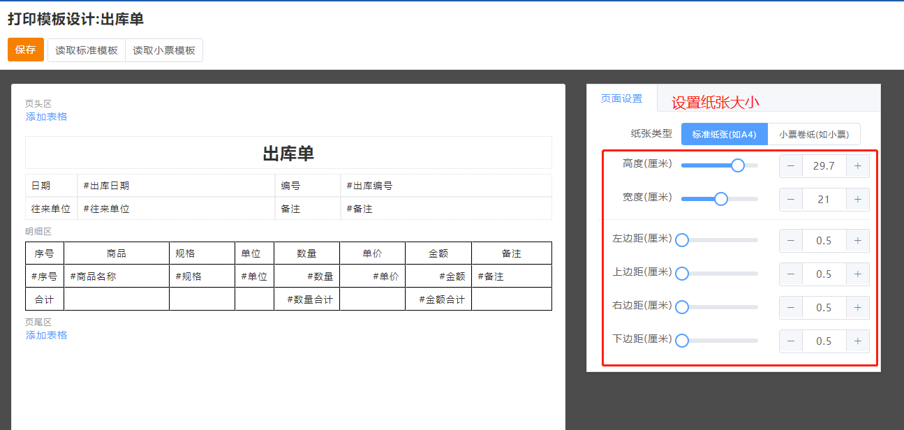 随后可以在标准模板上修改纸张大小,按照实际纸张尺寸修改。