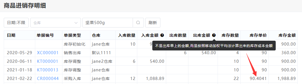 具体的库存成本单价,可以查询商品进销存明细行,此处的库存金额为所有仓库此商品的总金额,库存单价=库存总金额/库存总数量。