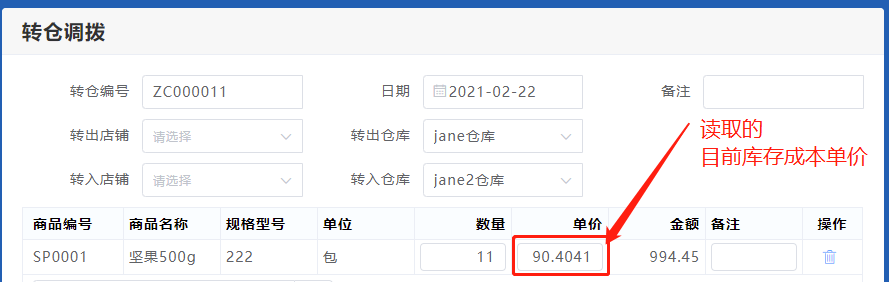 (注意:此处的转仓单单价,可以修改,但是仅限于转仓单详情单和列表上显示,不影响库存成本核算。主要为了便于部分用户,需按照售价,查看转仓金额)