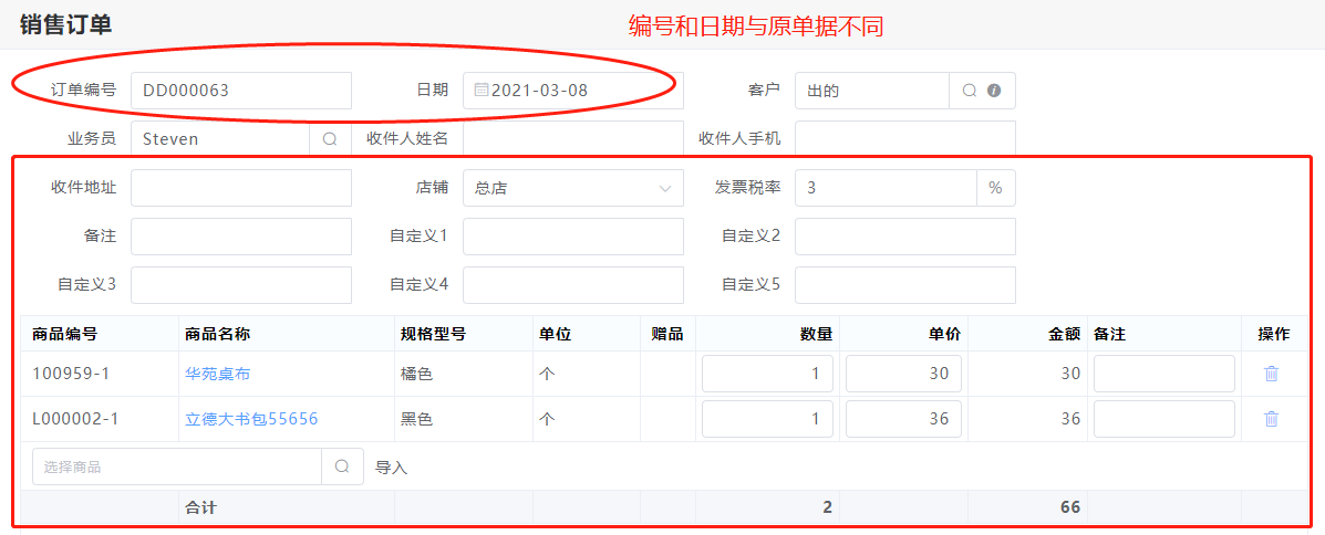 (注意:复制的单据除了订单编号会累加,日期为默认为当天的日期,其余信息与原单据一致)