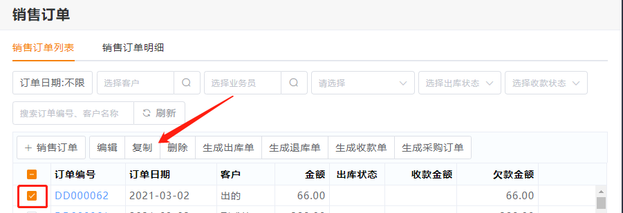 2.进入销售订单列表,选择需复制的订单,点击列表上复制按钮。