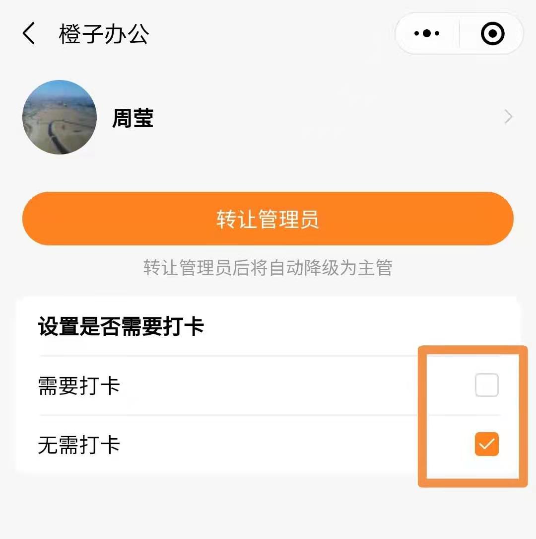 橙子考勤中,针对每个用户,包括管理员,可以设置需要打卡和无需打卡两种方式,效果如下: