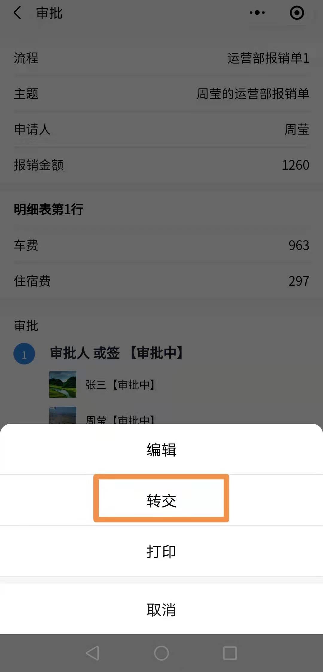 橙子审批,审批人在审批中时,由于一些原因,不能自己审批,可以转交他人审批。