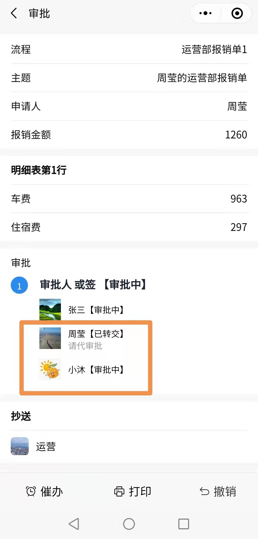 3.该审批人审批步骤即显示,已转交,且转交人也成为下一个审批人。