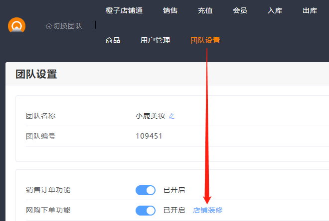 1.管理员在团队设置中,点击店铺装修。