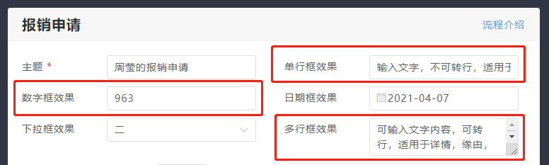 【多行框】:可输入文字内容,可转行,适用于详情,缘由,备注等。