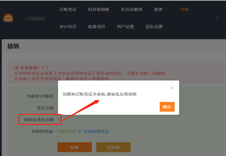 1.直接进入结账栏,若有未审批的凭证,结账会有相关提示。