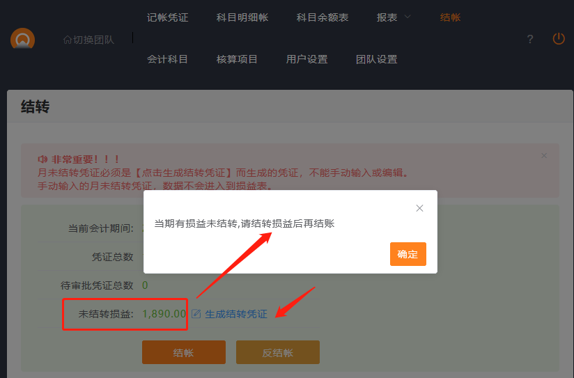 2. 其次,如果有未结转损益,需要先结转,才可以再继续结账。