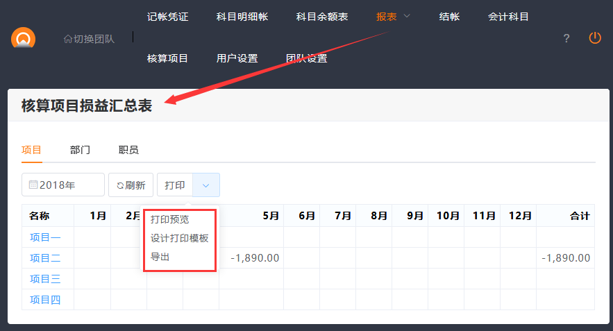 开启项目核算后, 报表中会增加一个核算项目损益汇总表,可以统计相关项目的损益等。