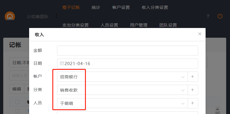2.新增收入记账,帐户、分类、人员均已默认为常用的帐户、分类及人员。