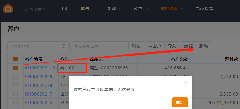 删除客户资料,提示有关联单据,需删除对应的单据,再尝试删除客户。