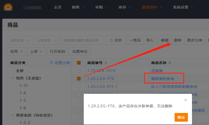 删除商品,提示有关联单据,需删除对应的单据,再尝试删除商品。