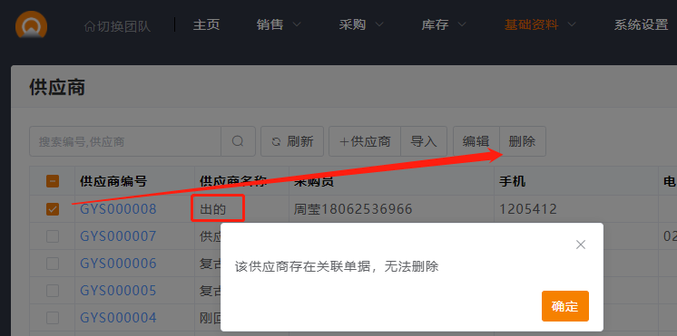 删除供应商资料,提示有关联单据,需删除对应的单据,再尝试删除供应商。