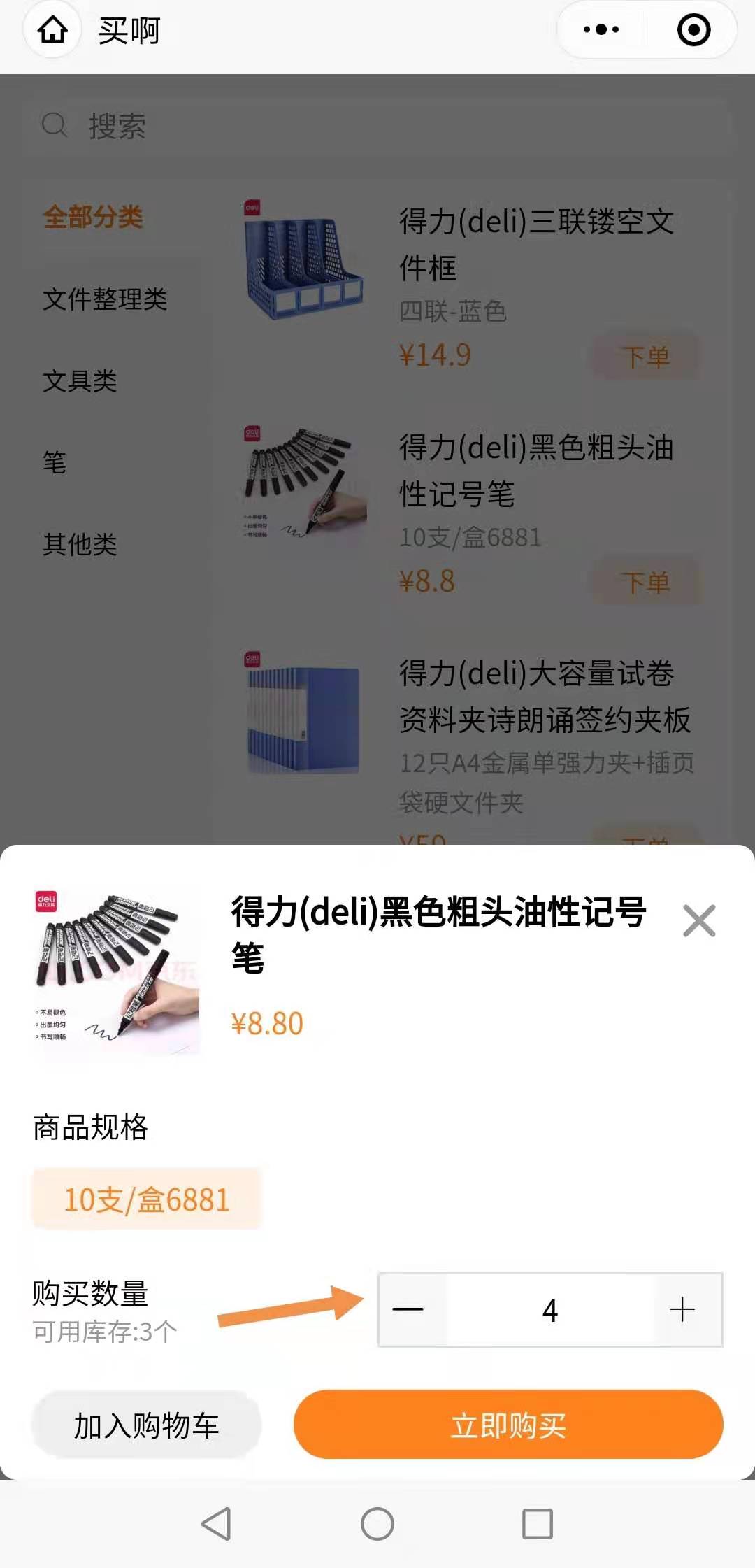 2.会员在买啊,查看商品,商品库存显示3个,下单4个。